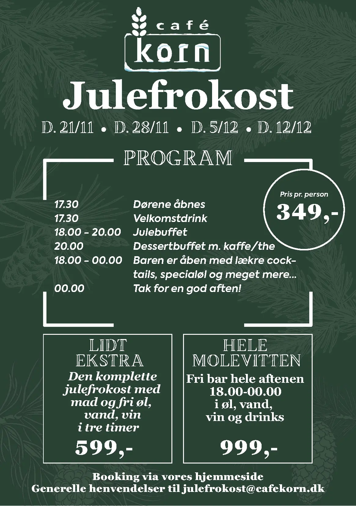 Gør det nemt for dig selv og bestil julemaden fra Café Korn hvor kuvertprisen er 249 kr.